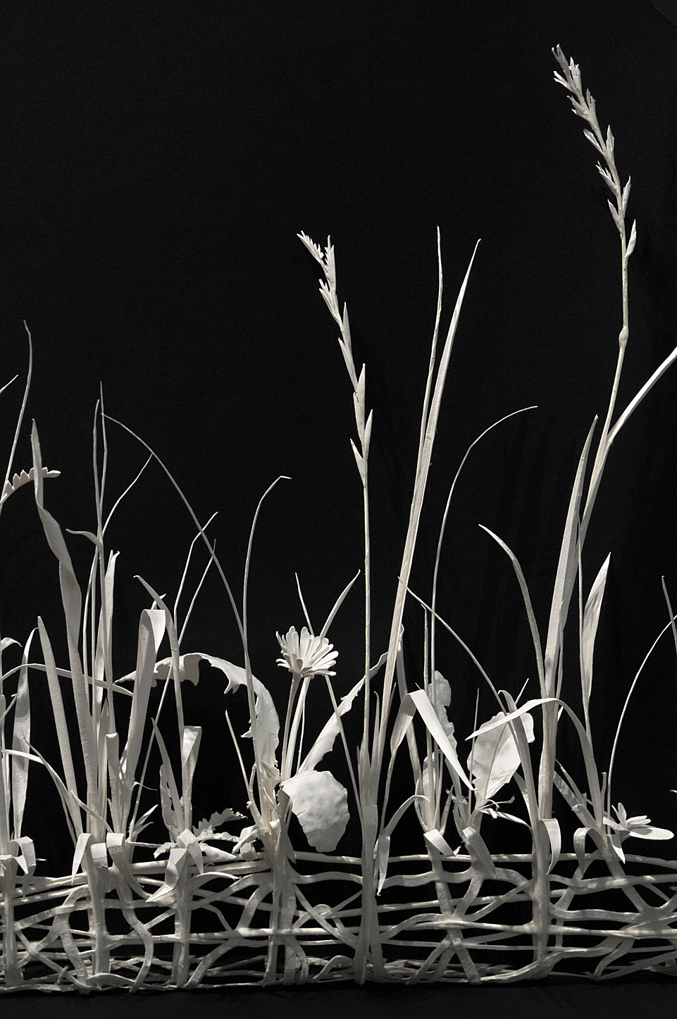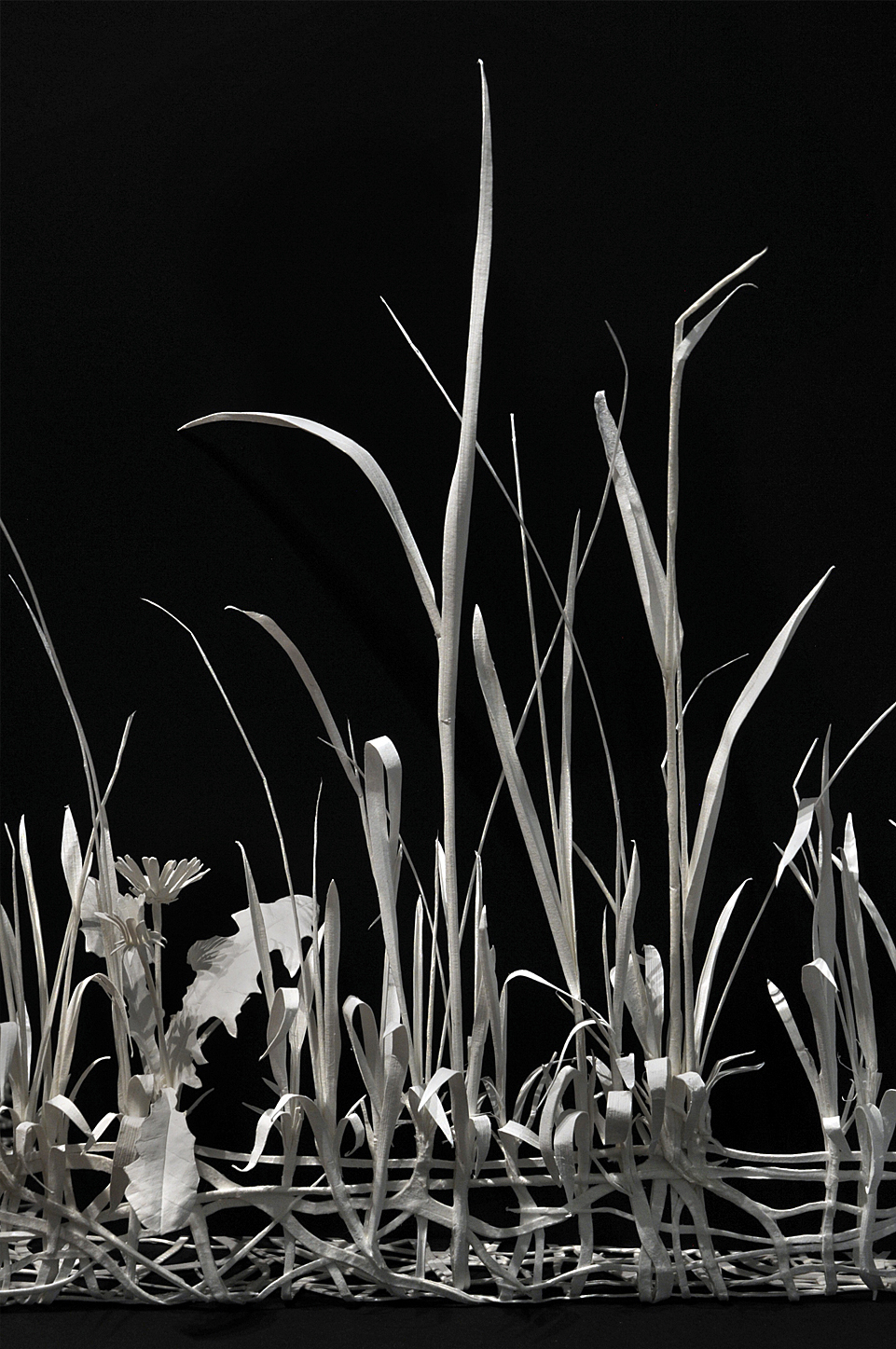 The work consists of a grid of nine tiles in which the original elements are absent. What remains are contours and a network of root- and grass-like structures that form around the missing tiles, outlining their shape from the outside.