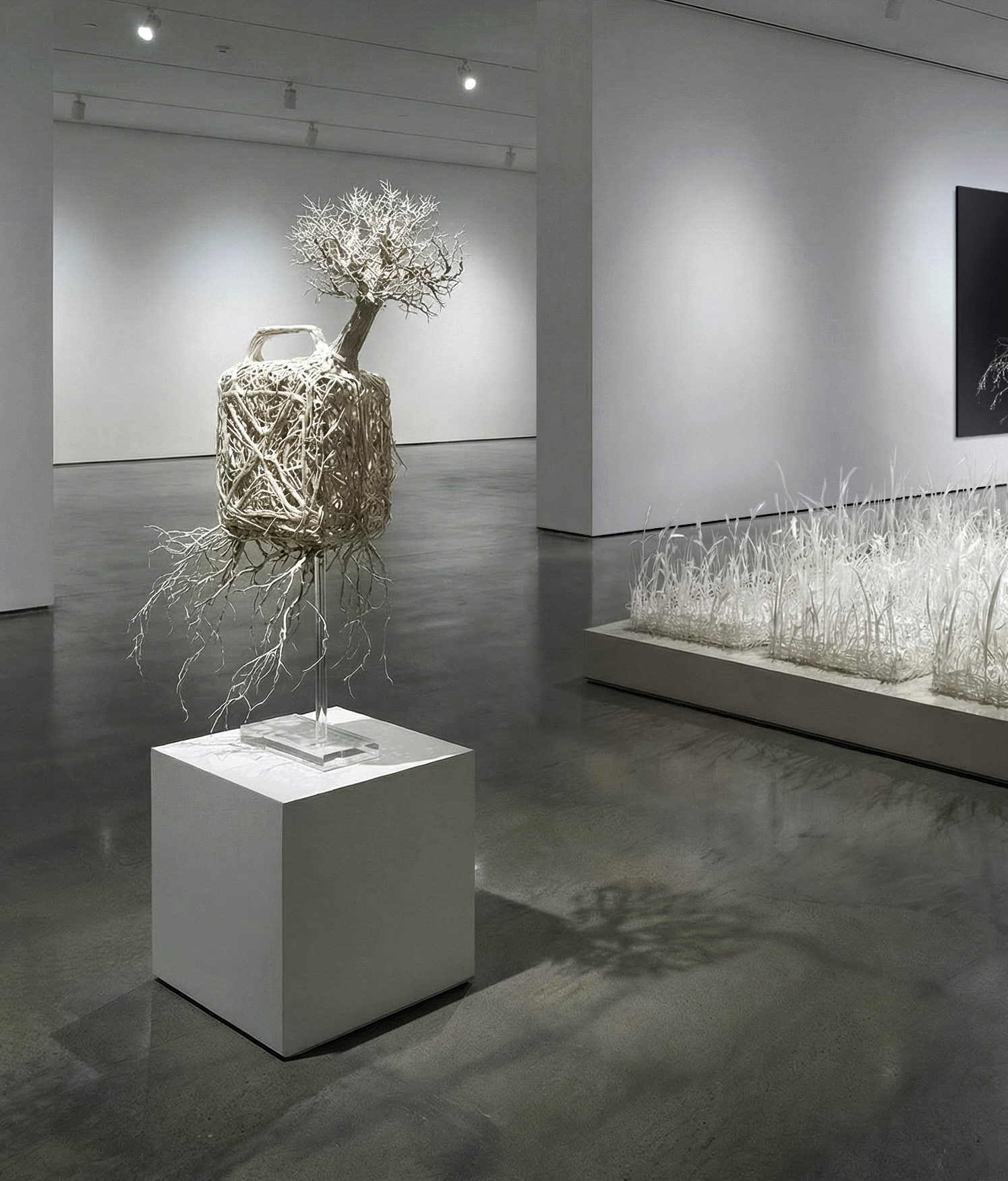 The roots hang freely in space, without ground or context. What appears to grow is not tied to a natural origin.