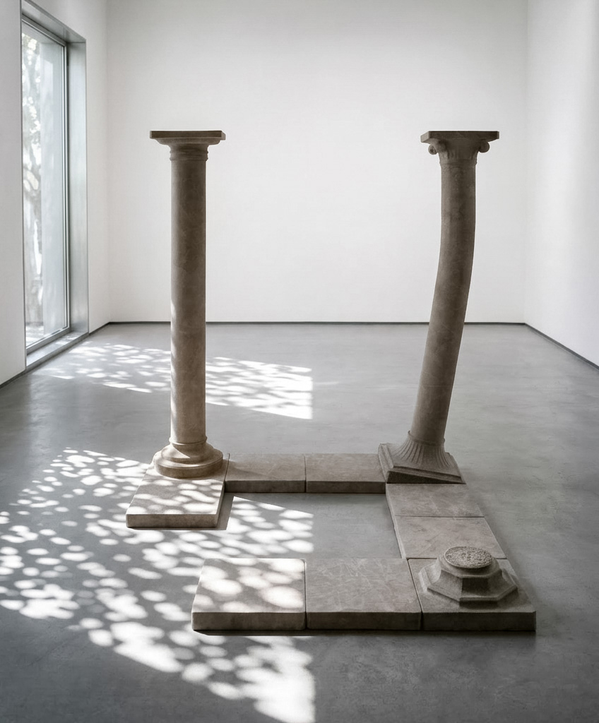 Hoewel de kromme zuil haar top op gelijke hoogte brengt met de rechte zuil, blijft de basis ongelijk. De installatie toont een evenwicht dat ontstaat binnen een onvolledige configuratie.